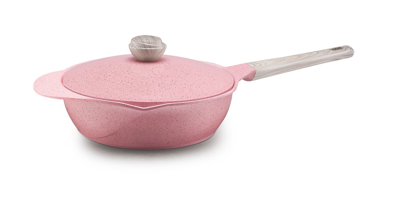 2018 New arrival pink marble nonstick coating saute pan with short and straight wooden handle
