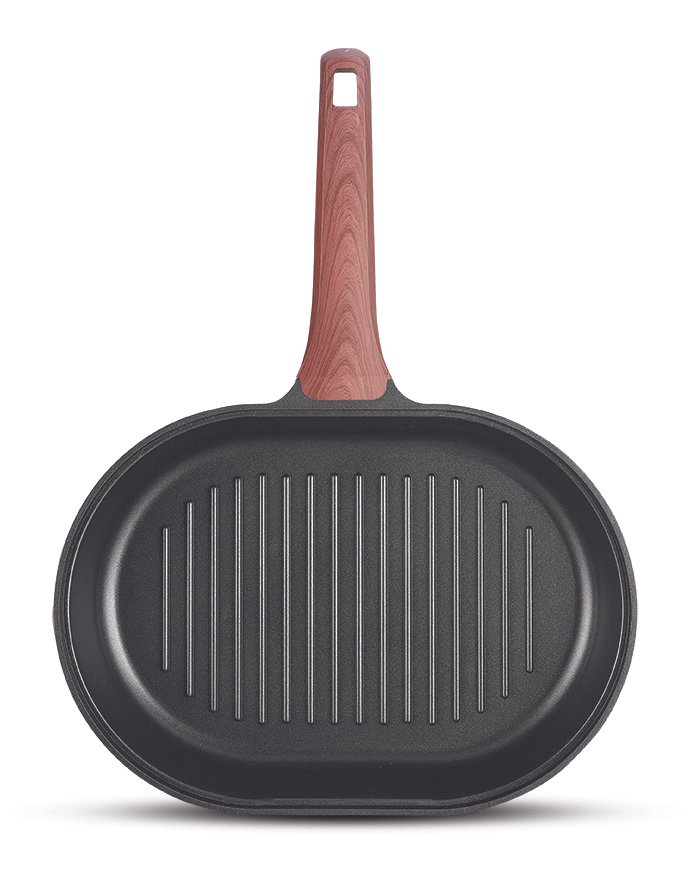 Classic black oval die-cast nonstick shallow grill pan with short wooden grain handle