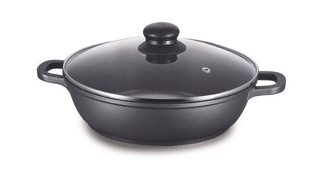 //Classic blue shallow nonstick aluminum alloy casserole with glass lid