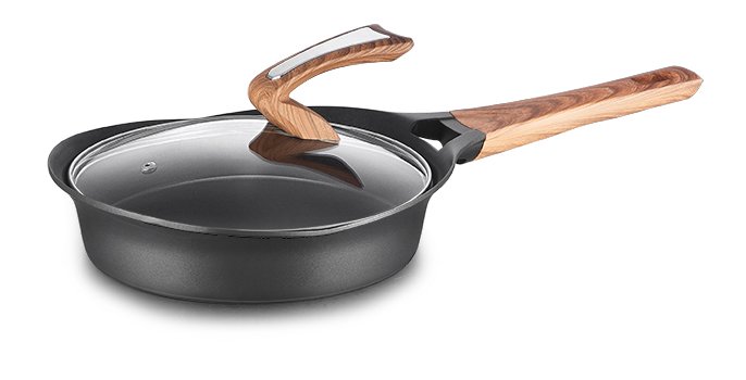 Eco-friendly shallow nonstick sauce pan for cooking soup with straight wooden handle/glass lid with curving wooden handle